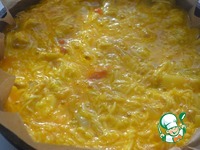 Противень или форму для выпечки выстлать пергаментной бумагой. Распределить на ней овощи. Залить взбитыми яйцами с сыром. |
