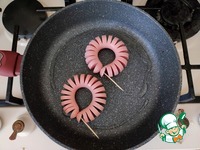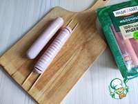 Сосиски освободить от оболочки, поместить каждую сосиску между деревянных шпажек для приготовления шашлычков и сделать разрезы (см. фото) |