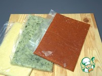 После заморозки достаю пакеты с чесноком из морозилки. Далее разрезаю пакеты, вынимаю заморозку и выкладываю на разделочную доску. |