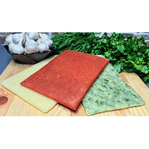 Беру пластину чеснока и нарезаю её на произвольные полоски или кубики. Режется такой пласт очень легко и просто. Таким же образом нарезаю чеснок с зеленью и с молотой паприкой. |