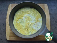 На омлет выкладываю ломтики ветчины из индейки, натертый на крупной терке сыр и для пикантности измельченный маринованный перец халапеньо. |