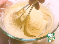 Затем к яичной массе добавляем муку с гашенной содой и ещё раз все перемешиваем и отставляем на 5 минут. |