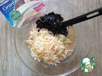 Добавить тертый сыр (у меня ТМ Hochland), измельченный чеснок и нарезанные листики базилика, перемешать. |