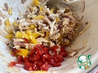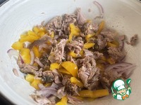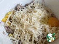 Полутвёрдый сыр натрите на крупной тёрке и добавьте к индейки и овощам. |