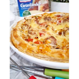 Пока тесто размораживается, подготовьте начинку. Фарш (у меня: свинина + говядина) посолите и поперчите по вкусу. |