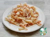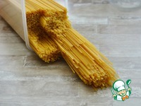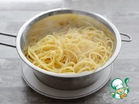 А тем временем у вас уже должны свариться макароны. Отваривайте их по времени не более 3-5 минут, откиньте на дуршлаг. Небольшое количество отвара от макарон сохраните. |