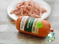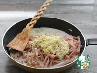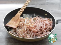 А на другой конфорке в сковороде будем готовить соус. Для соуса нарежьте соломкой ветчину. Я использовала ветчину из индейки ТМ "Индилайт". |