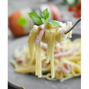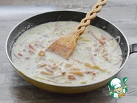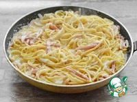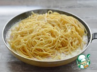 Потушите всё вместе еще 2-3 минуты, чтобы лингвини доготовились и напитались соусом. При необходимости (если вам покажется, что соус сильно густой), влейте немного отвара от макарон. |