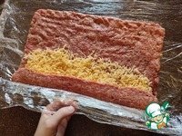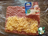 Фарш солим, перчим, добавляем любимые специи и раскатываем в пласт, толщиной -/+ 1 см. Я застилаю стол плёнкой в несколько слоёв и раскатывают прямо так. |