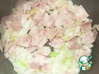 Отправляем в чашу масло, лук и ветчину — Режим «Жарка» 10 минут. (Не забываем перемешивать через 3-4 минуты). Можно готовить как с открытой крышкой, так и с закрытой). |