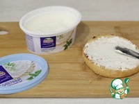 Затем намазать булочки творожным сыром (сливочным или грибным). |