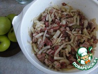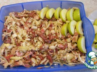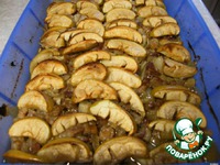 Мясо выкладываем в форму и покрываем яблоками. Яблоки очищенные от семечек, разрезанные на 8 долек каждое. |