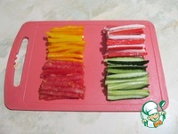 Крабовые палочки и овощи нарезать соломкой одинаковой длины. |