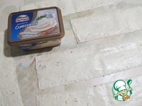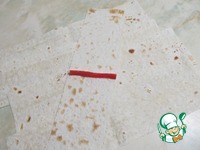Лист лаваша нарезать поперек полосами шириной равной длине крабовых палочек. |