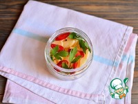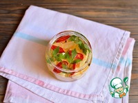 Крупно в банку порезать чеснок и перец чили с зернами, добавить веточки любистока. |