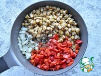 В сковороде разогреть растительное масло и добавить подготовленные овощи. Всыпать соль, сухие травки и измельченный красный острый перец (по желанию). Обжарить овощи, помешивая в течение 3-5 минут. |