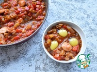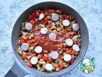 Добавить нарезанные кружочками сосиски из индейки "Индилайт" и влить томатный соус пассата, либо любой другой томатный соус. Потомить овощи в соусе до испарения лишней влаги. |