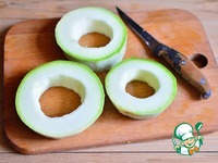 Кабачок порезать на порции вдоль, лучше выбирать тот, что больше диаметром. Вырезать сердцевину. |