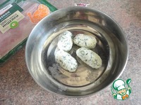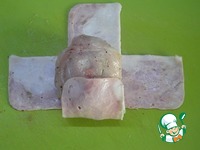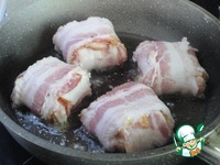 Каждый сырно-масляный шарик завернуть в отбитые грудки и затем в две полоски бекона. |