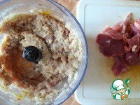 Нарезать лук и филе бедра индейки небольшими кусочками. Сделать фарш из мяса, лука, чеснока, 1 ч. л. натёртой цедры лимона, чёрного молотого перца, тимьяна. |