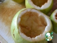 У яблок срезать верхушку, аккуратно удалить сердцевину при помощи ножа и чайной ложки. Сбрызнуть яблоки соком лимона. Сделать небольшой надрез поперёк каждого яблока. |