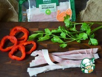 Затем "поднявшееся" тесто сбрызнуть оливковым маслом, пальцами рук сделать глубокие проколы и разложить начинку. Полоски бекона скрутить рулетиками и украсить. |