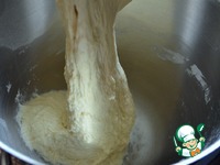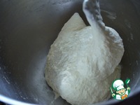 Влить масло, рукой "искупать" тесто в масле, затем на средней скорости, замесить тесто до однородности. Всего вымешивать тесто 8-12 минут. |