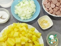 Режем сосиски колечками, картофель кубиками и шинкуем лук. Чеснок мелко шинкуем. |