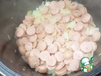 Отправляем в чашу масло, лук, чеснок и сосиски — Режим «Жарка» 12 минут. (Не забываем перемешивать через 3-4 минуты). |