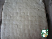 Затем разрежьте тесто по вертикали, чтобы получились маленькие квадратики. Всю поверхность пласта теста смажьте взбитым яйцом. Поставьте в духовку при температуре 180 градусов, на 20-25 минут. |