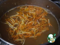 В кипящий бульон засыпать промытую крупу, варить на маленьком огне после закипания 20 минут. Затем заложить картофель и зажарку. Довести до кипения и варить 10 минут. |