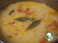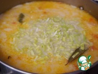Всыпать порей, потомить 3-4 минуты. Досолить, если требуется, снять с огня, удалить лаврушку. |