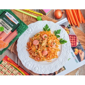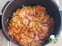 Через час к тушёной капусте добавить лук с морковью, сосиски и кетчуп. |