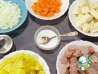 Мелко шинкуем лук и морковь. Сосиски режем колечками. Картофель так под нож (например кубиками). |