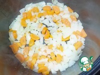 Отправляем в чашу масло, лук и морковь — Режим «Жарка» 10 минут (Не забываем перемешивать каждые 3-4 минуты). |