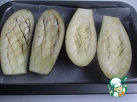 Нагреть духовку до 180-200 градусов. Баклажаны разрезать пополам вдоль, сделать насечки, смазать оливковым маслом и поместить на противень. |