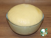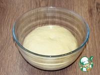 8. У меня уже через 30 минут, тесто увеличилось в 2,5 раза. Тесто обминаем, закрываем пленкой и оставляем еще для второго подъема. |