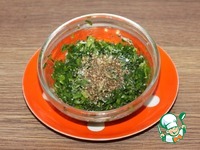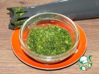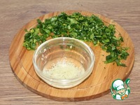 9. Приготовим зеленый соус. Нарезаем зелень. Очищенный зубчики чеснока прессуем и смешиваем с солью и подсолнечным маслом. |