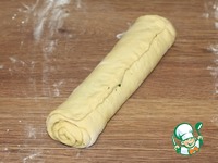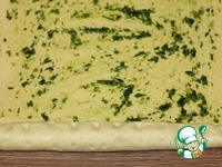 14. Затем каждую часть раскатываем в пласт толщиной 0,5-0,8 см и смазываем зеленым соусом. Скатываем пласт теста в рулет. |