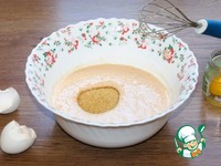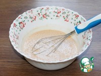 4. В жидкую смесь небольшими порциями просеиваем муку. Немного муки (1/4 часть) оставляем. |