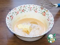 3. Затем вливаем молоко 100 мл, растительное масло 2 ст. л. и вмешиваем мягкое сливочное масло, перемешиваем. |