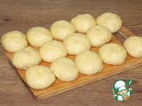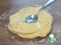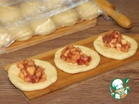 14. Тесто подошло, и мы поочередно раскатываем кругляки теста в лепешки. Раскладываем начинку по 1 ст. л. с горкой на каждую лепешку. |