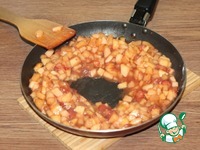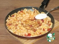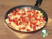 9. Очищаем фрукты - яблоки от шкурки и семечек, у клубники удаляем хвостики и нарезаем небольшими кубиками. Добавляем фрукты в сковороду и перемешиваем. |