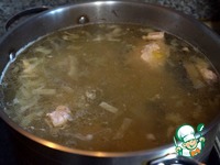 Из готового бульона вынуть кости, бульон процедить в другую кастрюлю. Бульон довести до кипения, поместить туда картошку, дать закипеть, убавить температуру до средней и варить 12 минут. |