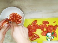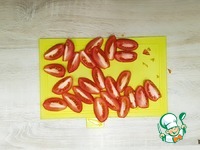 Помидоры разрезаем пополам, удаляем места крепления плодоножки, далее режем на четвертинки. |