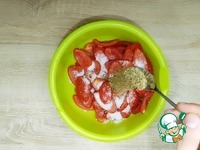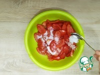 В простирилизованную банку выкладываем помидоры, добавляем 2 зубчика чеснока. Данный объем помидоров на банку 200мл. |