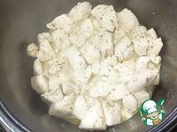 Отправляем в чашу масло, курицу и специи — Режим «Жарка» 15 минут (Не забываем перемешивать каждые 2-3 минуты). |