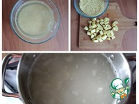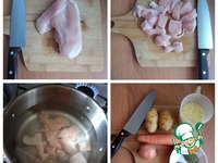Пшено нужно тщательно промыть в нескольких водах. Картофель нарезаем произвольно. Отправляем всё в кастрюлю, где варится куриное филе. Варим под крышкой на минимальном огне минут 15. |