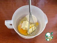 В другой миске смешать 1 яйцо и 1 желток, сливочное масло, сахар, щепотку соли. |