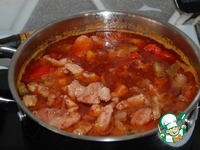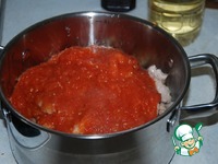 Выложить мясо в кастрюльку, добавить томатное пюре, рассол и пюрированные соленые помидоры без кожицы. Все перемешать и поставить на максимальный огонь. |